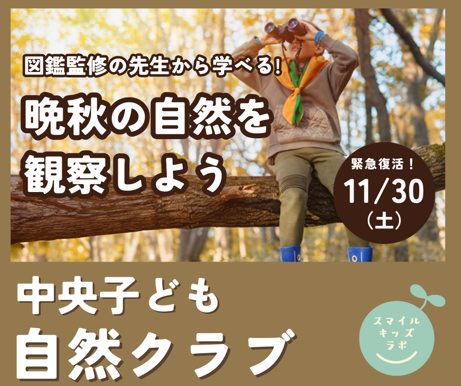 ![]() | 中央こども自然クラブ 会場 : 北の丸公園近郊 | 11月30日(土) | 10:30~12:00ごろ | 詳細・参加お申し込みはこちら |
